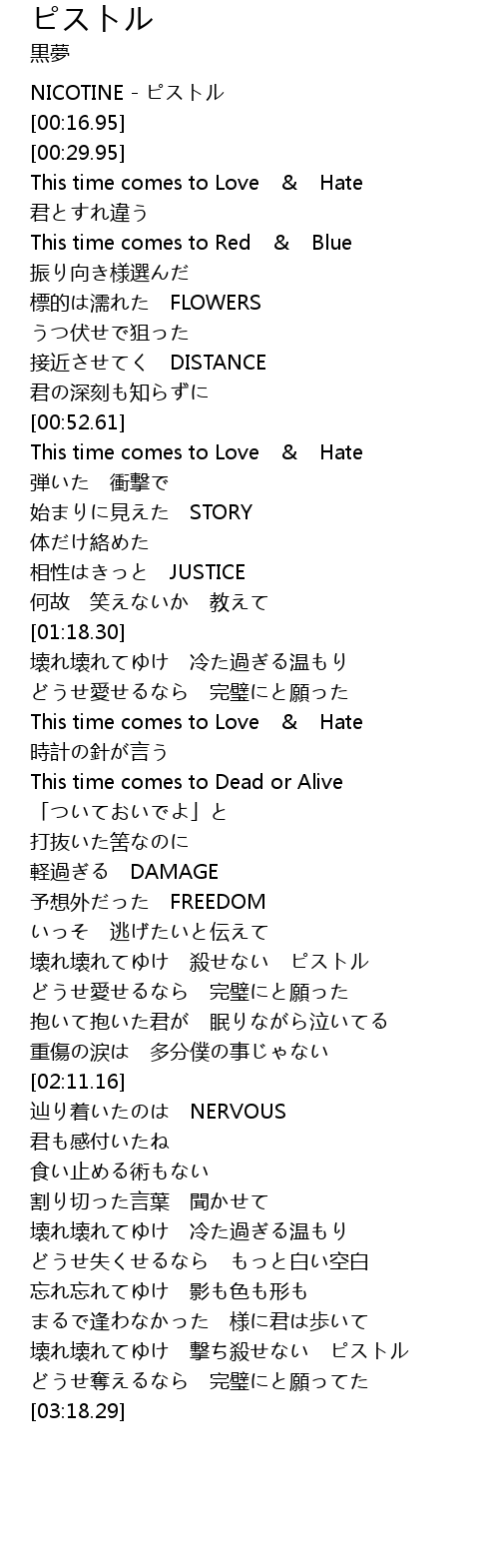 | [01:50.59] | 壊れ壊れてゆけ 殺せない ピストル |