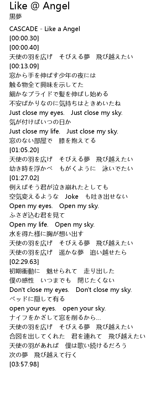 | [00:00.50] | 天使の羽を広げ そびえる夢 飛び越えたい |