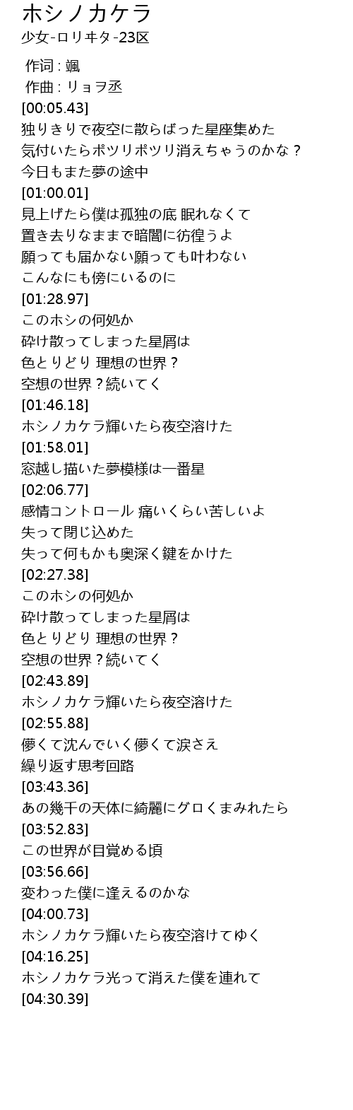 | [04:17.69] | ホシノカケラ光って消えた僕を連れて |