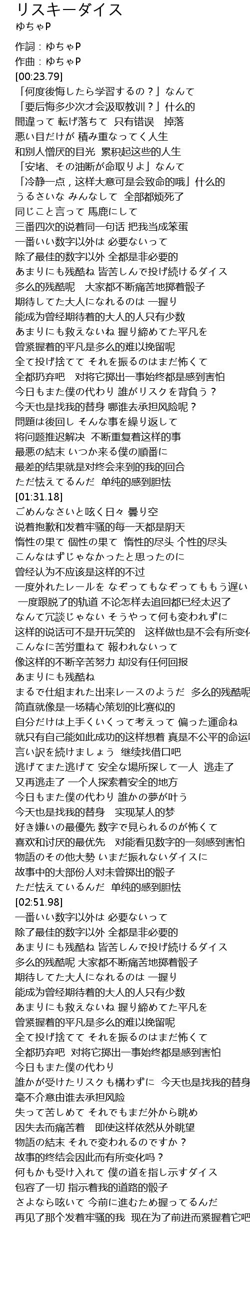 | [03:48.31] | 何もかも受け入れて 僕の道を指し示すダイス 包容了一切 指示着我的道路的骰子 |