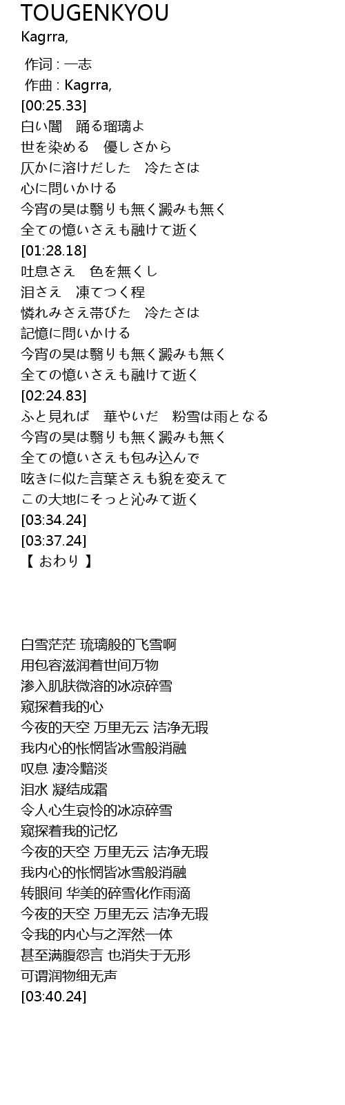 | [00:27.33] | 白い闇 踊る瑠璃よ |