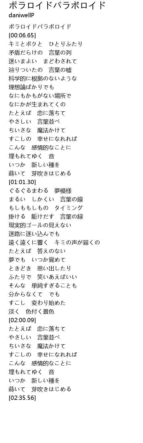 | [01:12.54] | ぐるぐるまわる 夢模様 |