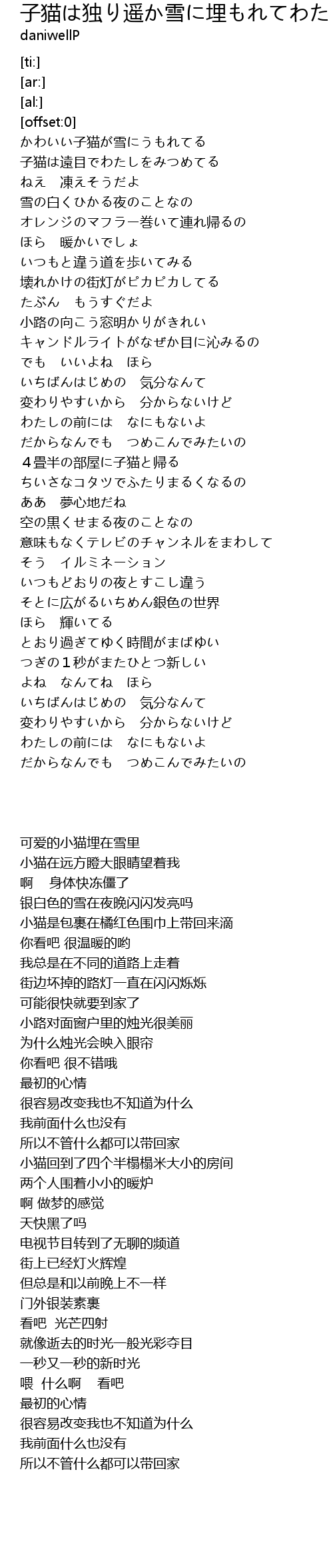 | [00:09.40] | かわいい子猫が雪にうもれてる |