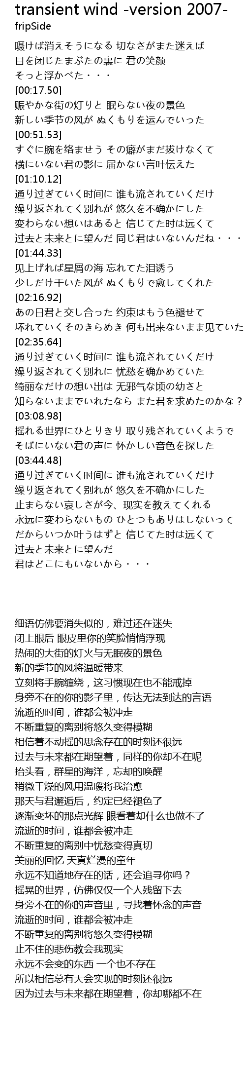 | [01:35.08] | 过去と未来とに望んだ 同じ君はいないんだね・・・ |