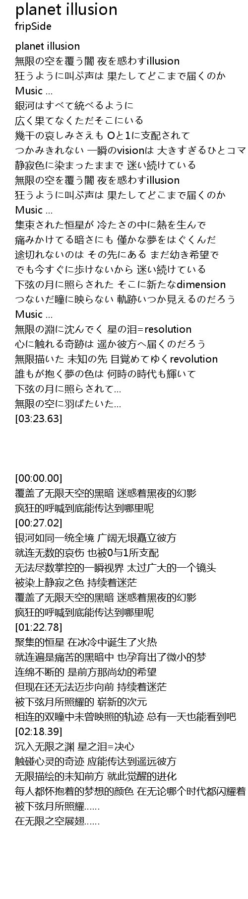| [00:13.97] | 無限の空を覆う闇 夜を惑わすillusion |