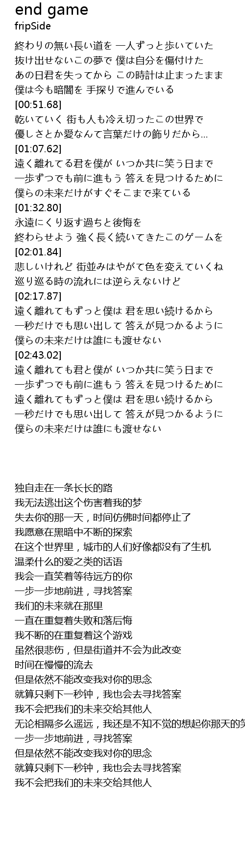 | [01:54.93] | 終わらせよう 強く長く続いてきたこのゲームを |