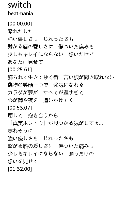 | [00:28.81] | 飾られて生きてゆく街 言い訳が聞き取れない |