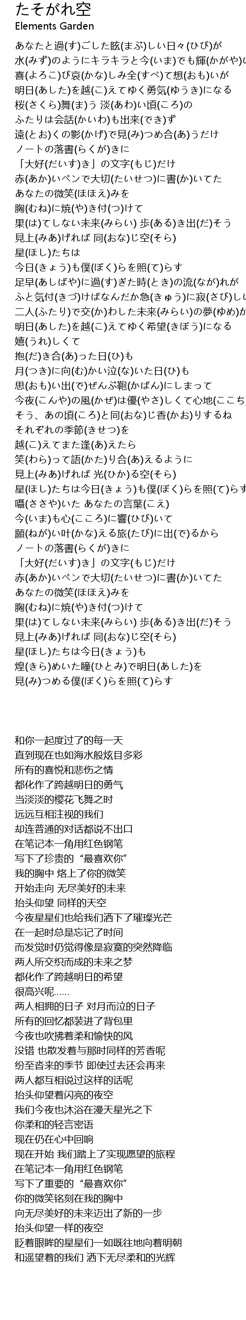 | [04:23.350] | 見上(みあ)げれば 同(おな)じ空(そら) 星(ほし)たちは今日(きょう)も |