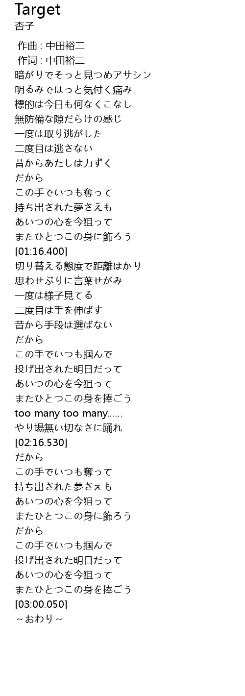| [02:50.850] | あいつの心を今狙って |
