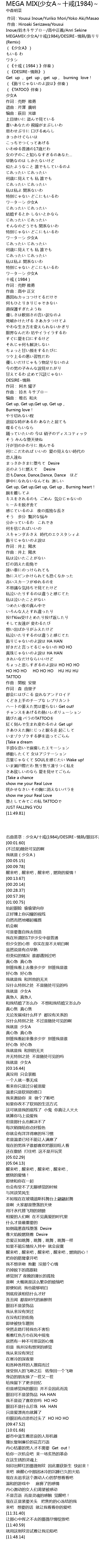 | [00:01.12] | MEGAMIX:少女A/十戒(1984)/DESIRE~情熱/飾りりじゃないのよ涙は/TATTOO (Remix) |