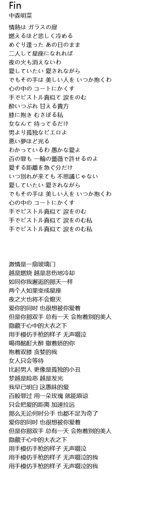 | [03:33.35] | 手でピストル真似て 涙をのむ私 |