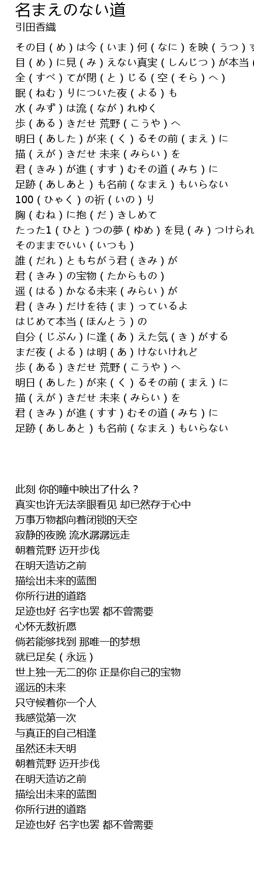 | [01:54.300] | たった1(ひと)つの夢(ゆめ)を見(み)つけられたらいいね |