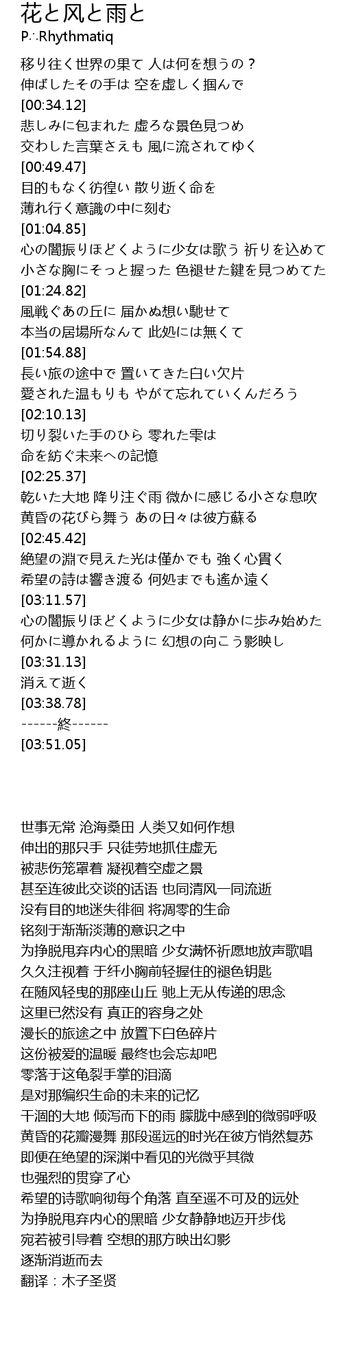 | [00:19.50] | 移り往く世界の果て 人は何を想うの? |
