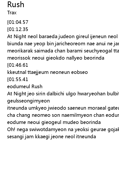 | [02:32.57][01:55.41][00:54.37] | aswiul geotdo miryeondo eopda bollyumeul nopigo i eodumeul Rush |