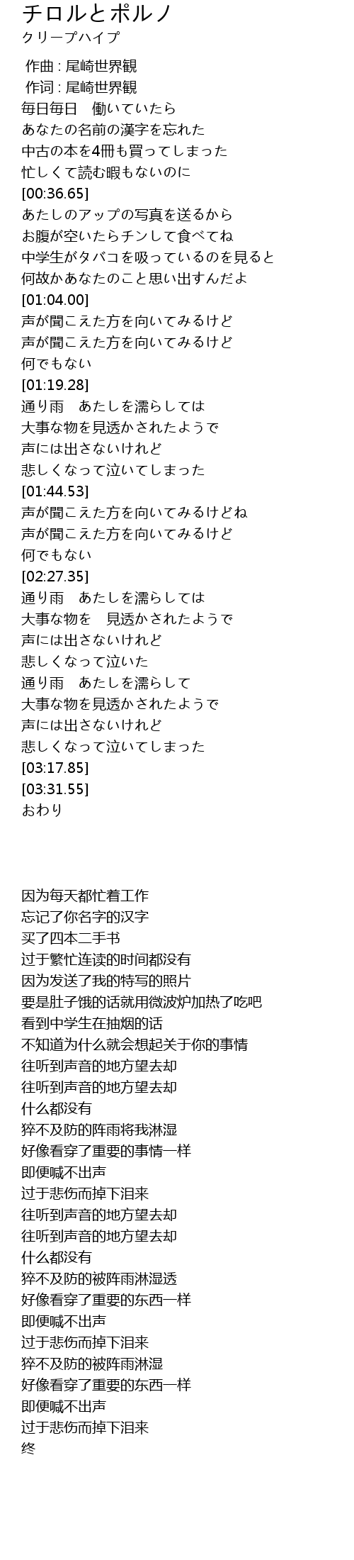 | [00:01.00] | 作词 : 尾崎世界観 |