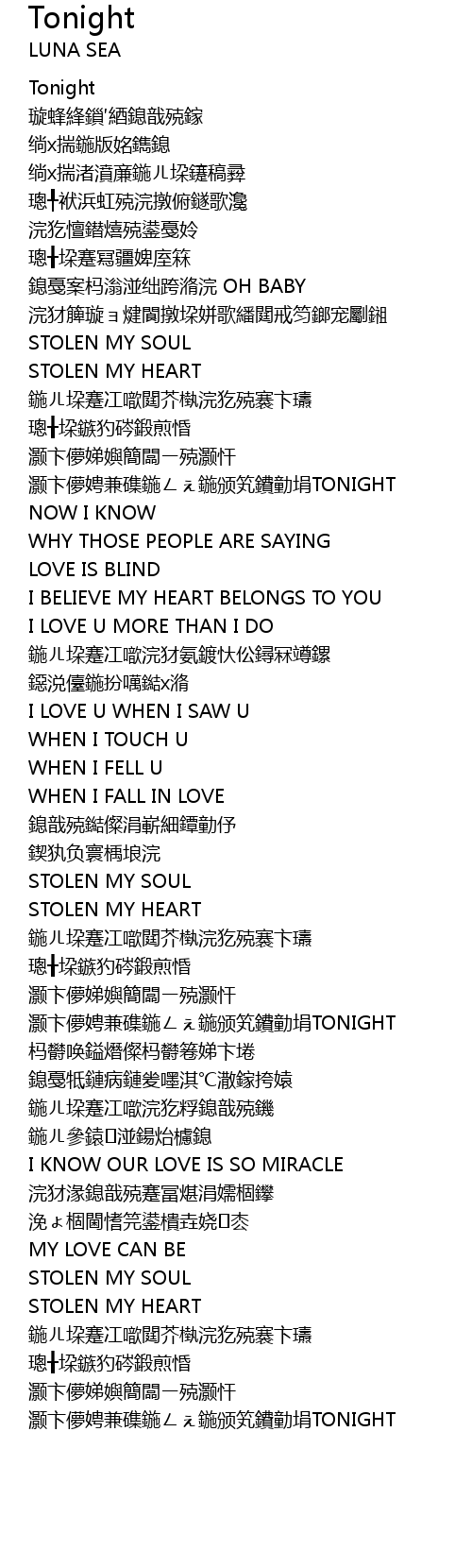| [03:38.65] | hào biàn méng pīng jiān zá shī shī bān wan fèi tóng juǎn TONIGHT |