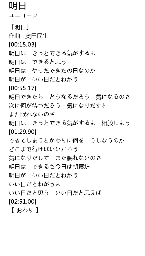 | [00:39.27] | 明日は やったできたの日なのか |