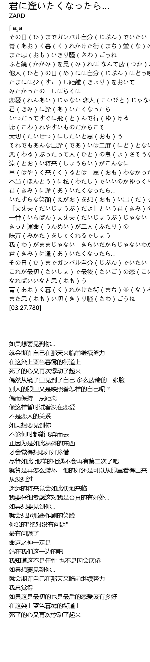 | [00:09.160][la:ja] | 君(きみ)に逢(あ)いたくなったら… |