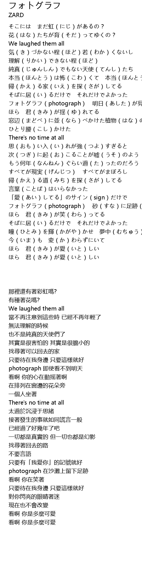 | [01:17.61] | フォトグラフ(photograph) 明日(あした)が見(み)えなくても |
