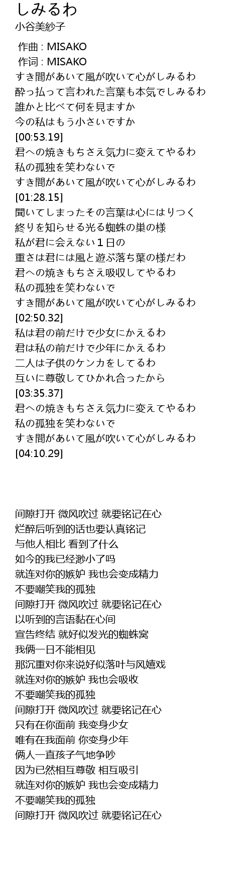 | [03:58.24] | すき間があいて風が吹いて心がしみるわ |