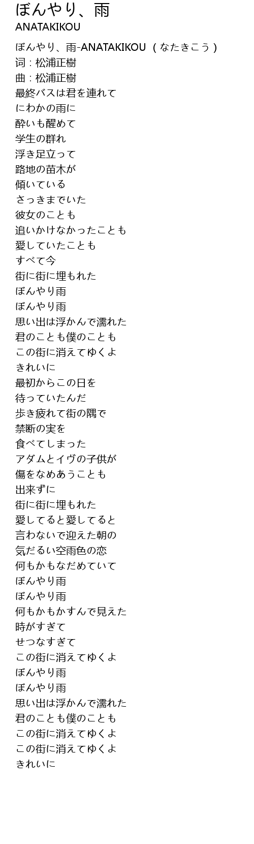 | [00:00.00] | ぼんやり、雨-ANATAKIKOU (なたきこう) |