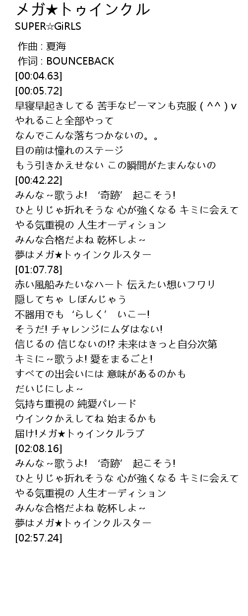 | [02:49.69] | みんな合格だよね 乾杯しよ~ 夢はメガ★トゥインクルスター |
