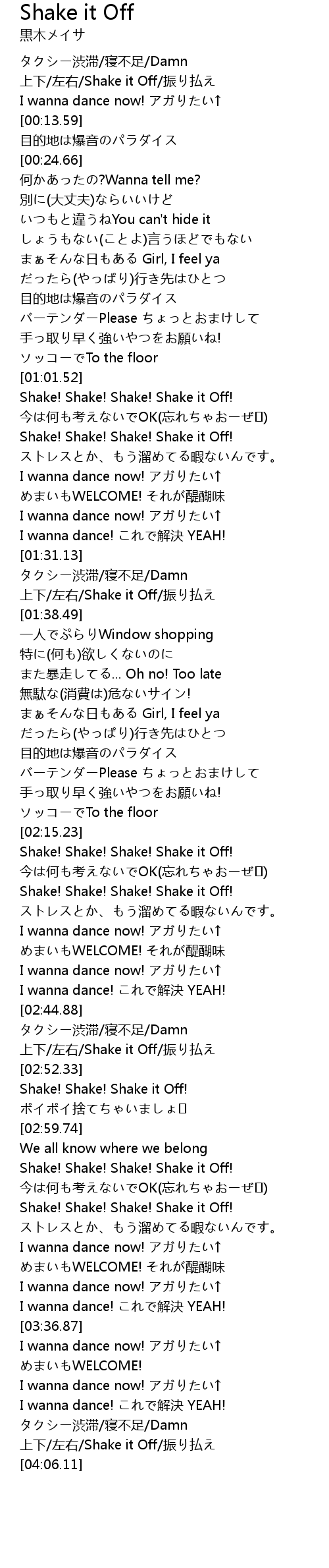| [03:07.15] | Shake! Shake! Shake! Shake it Off! |