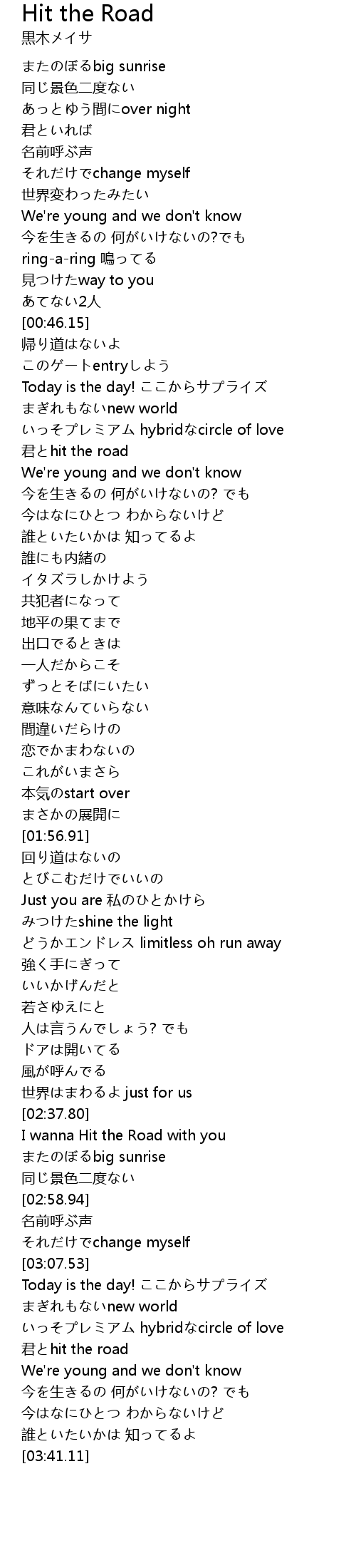 | [03:20.24] | 君とhit the road |