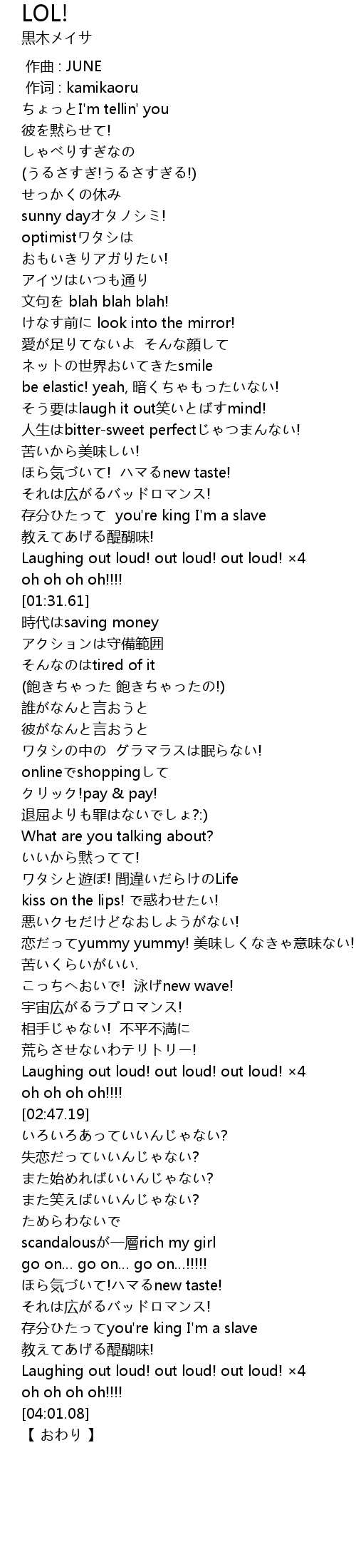 | [01:15.81] | Laughing out loud! out loud! out loud! ×4 |