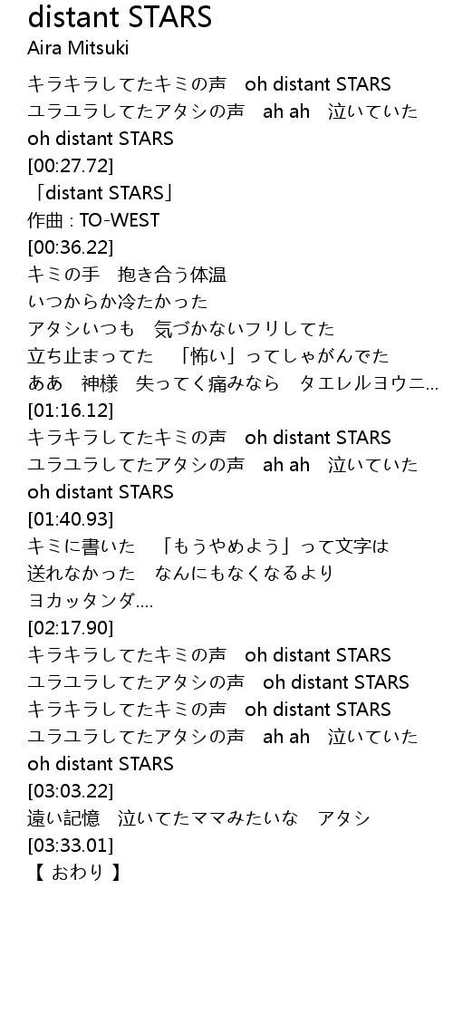 | [00:02.64] | キラキラしてたキミの声 oh distant STARS |