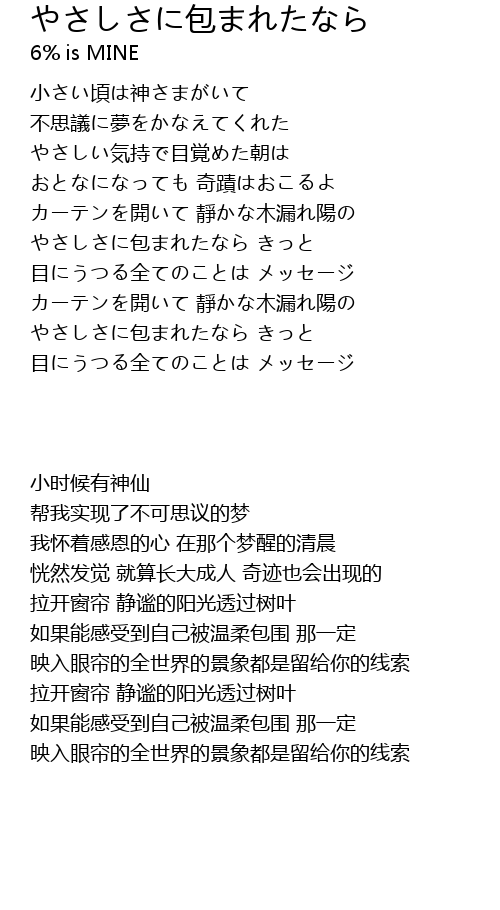 | [00:51.69] | やさしさに包まれたなら きっと |