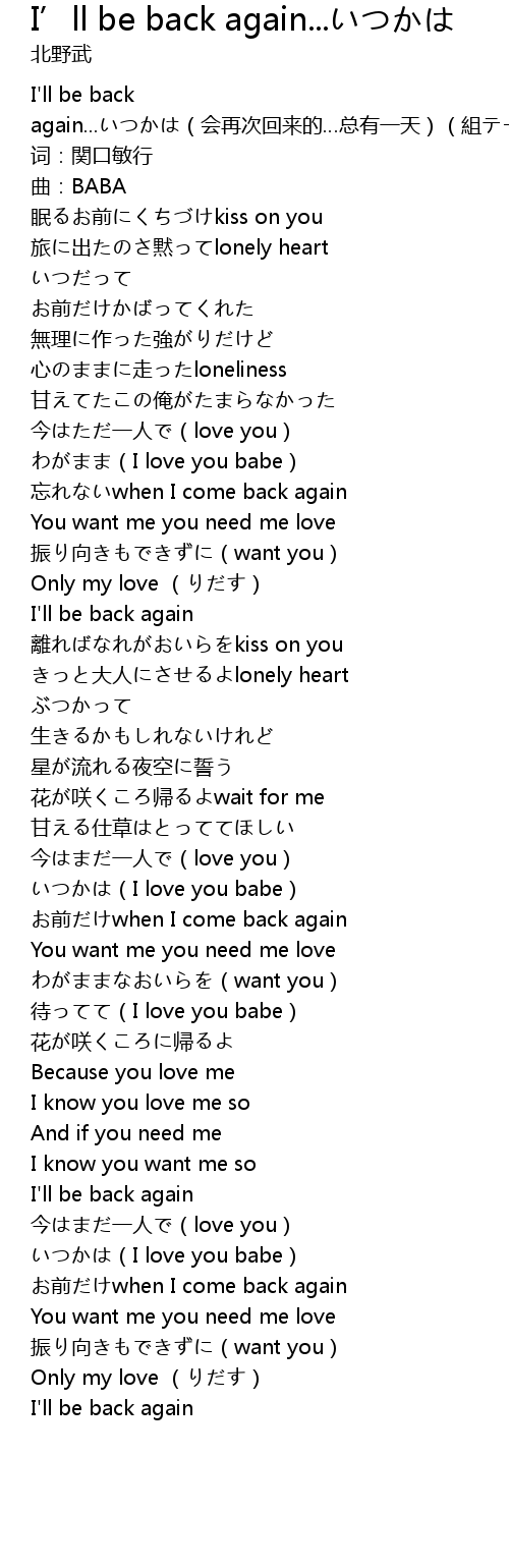| [00:00.00] | I'll be back again...いつかは(会再次回来的…总有一天)(組テーマ&ユニットコレクション)-北野武(たのたけし) |