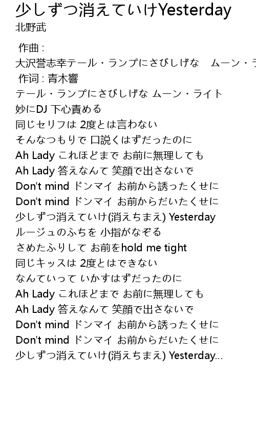 | [01:31.51] | 少しずつ消えていけ(消えちまえ) Yesterday |