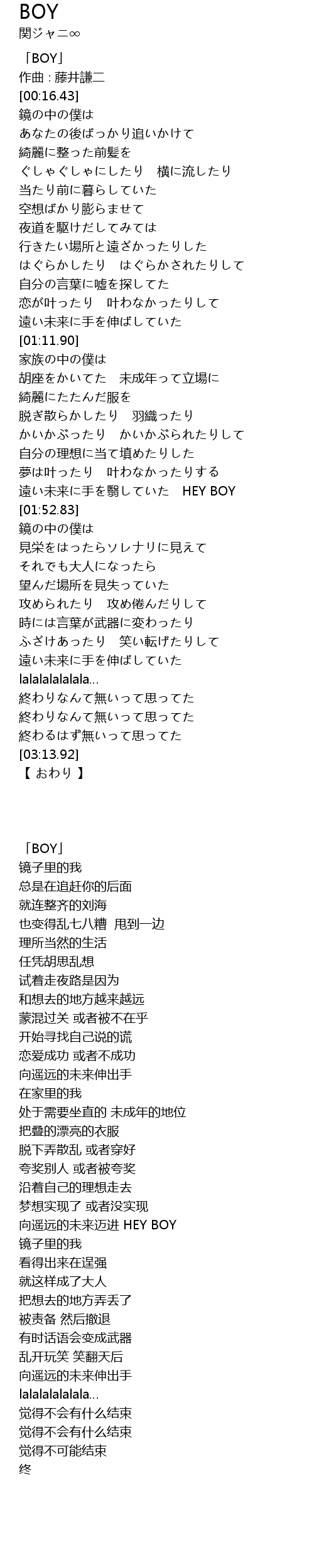 | [01:47.74] | yuǎn wèi lái shǒu yì HEY BOY |