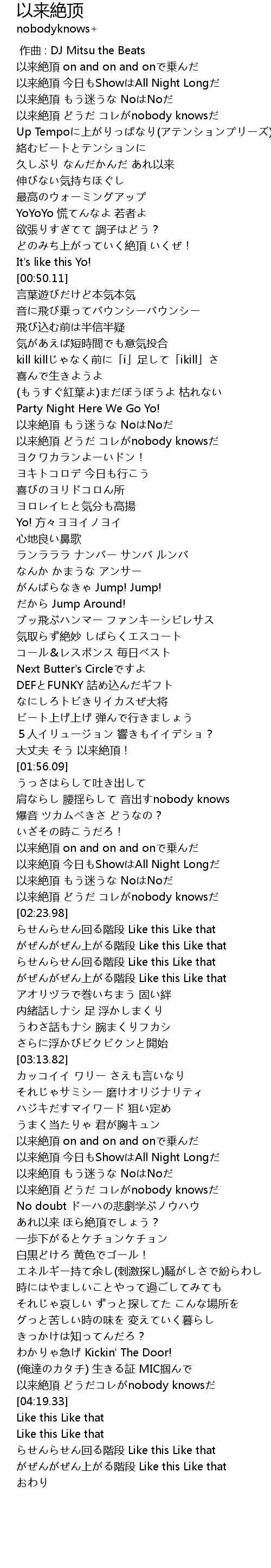 | [00:26.84] | 以来絶頂 どうだ コレがnobody knowsだ |