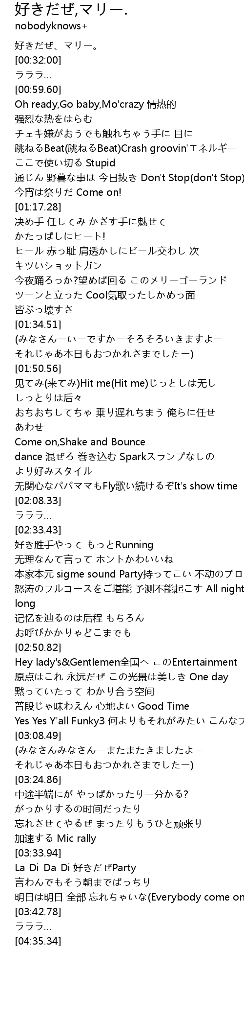 | [03:34.52] | La-Di-Da-Di 好きだぜParty 言わんでもそう朝までばっちり |