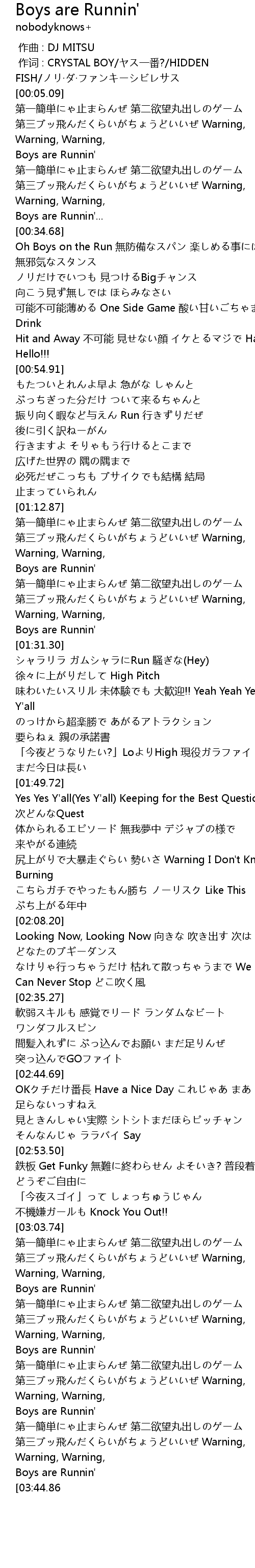 | [00:36.66] | Oh Boys on the Run 無防備なスパン 楽しめる事には 無邪気なスタンス |