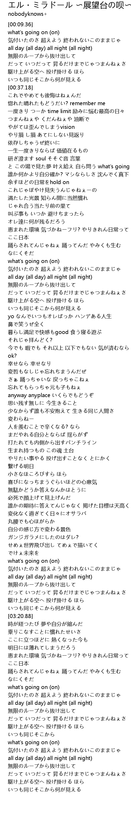 | [01:12.71] | と この場で見た夢 叶え給え 自ら問う what's going on |