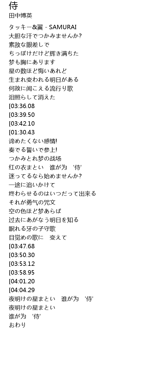 | [02:59.46] | 夜明けの星まとい 谁が为 '侍' |