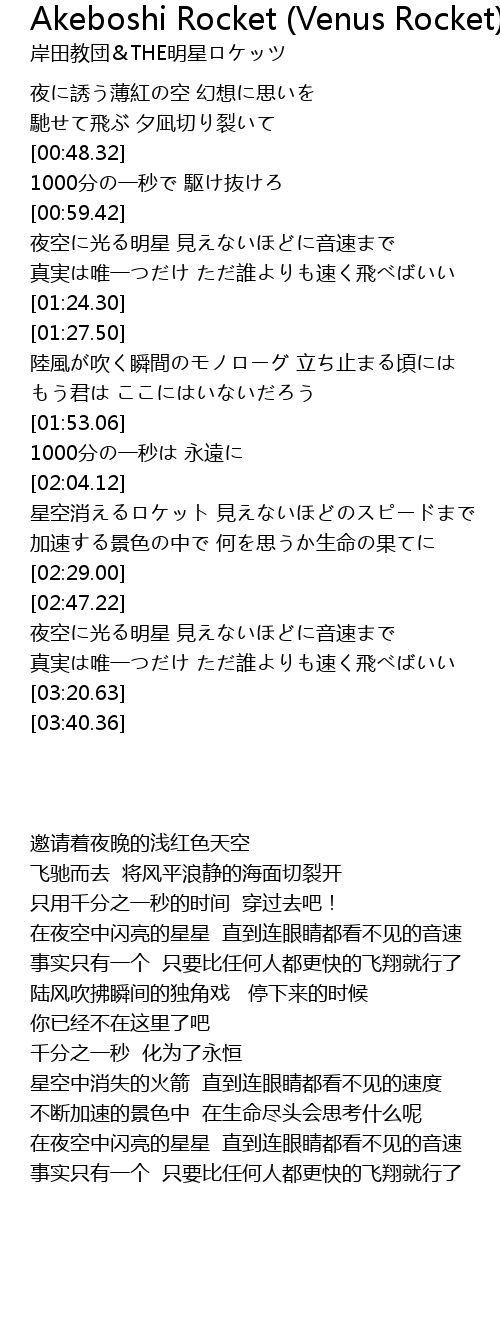 | [02:04.75] | 星空消えるロケット 見えないほどのスピードまで |