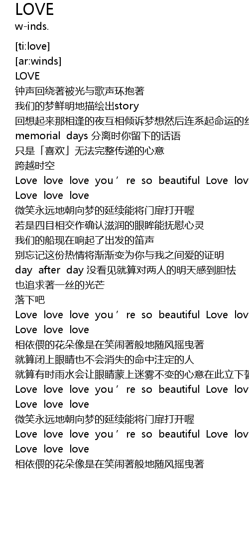 | [03:02.43] | Love love love you ' re so beautiful Love love yī zhí xún zhǎo zhe |