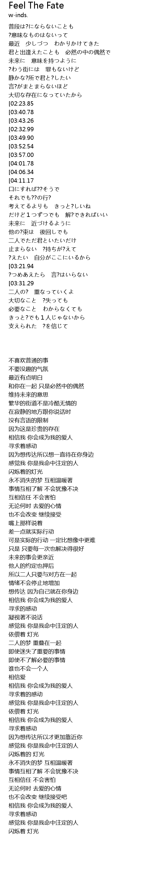 | [01:07.75][02:32.99][03:28.93][03:47.82][04:25.23] | Feel me'you gonna be my fate |