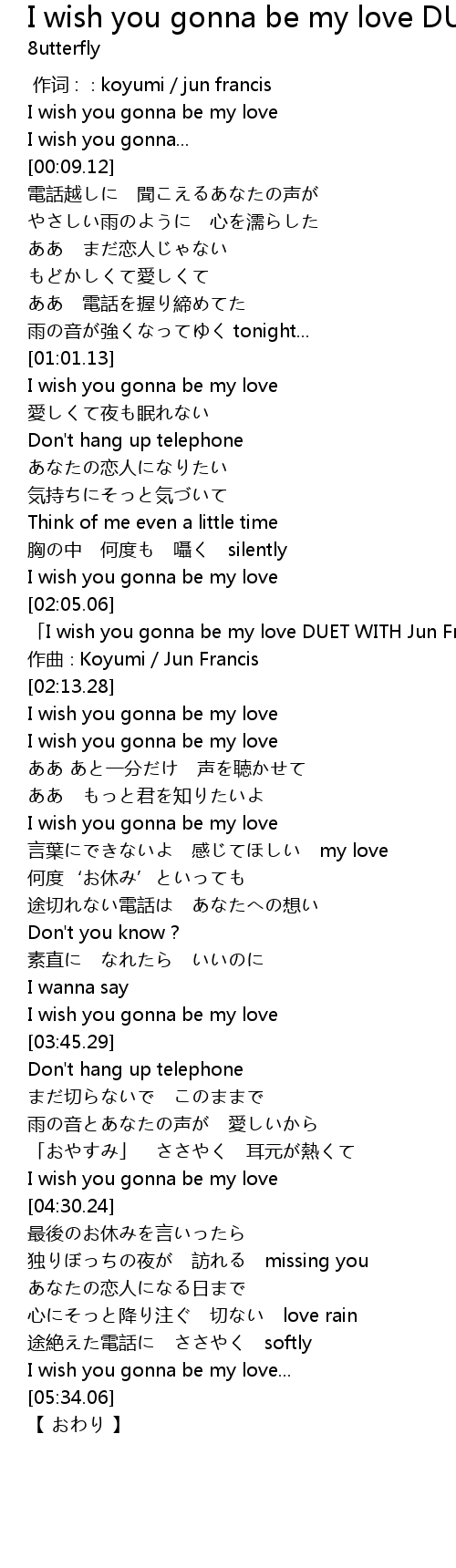 | [02:07.28] | 「I wish you gonna be my love DUET WITH Jun Francis」 |