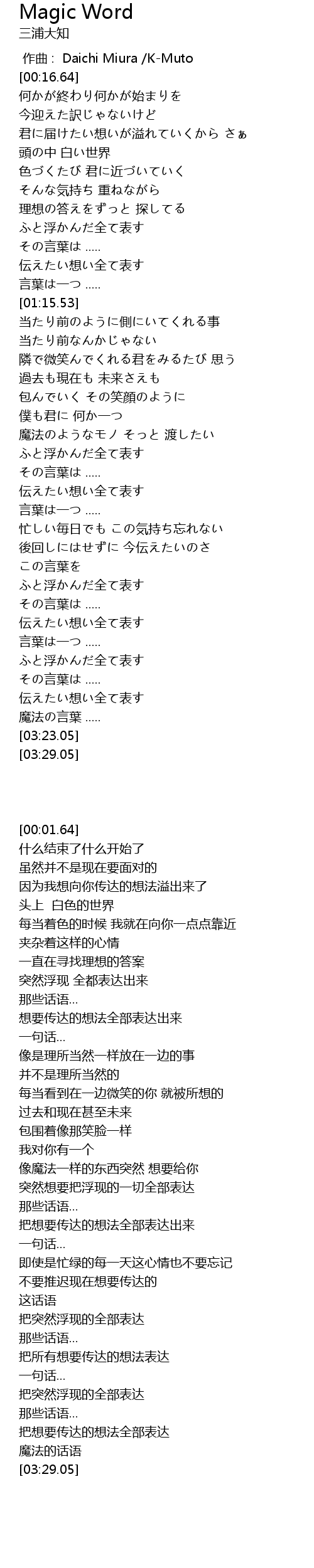 | [00:00.00] | 作曲 : Daichi Miura /K-Muto |