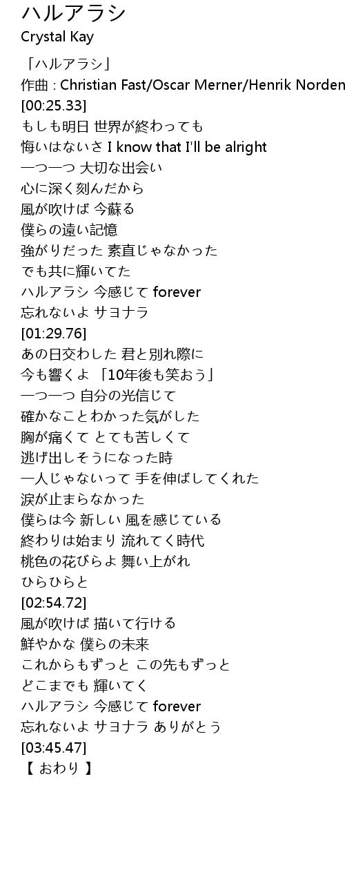 | [03:22.65] | ハルアラシ 今感じて forever |