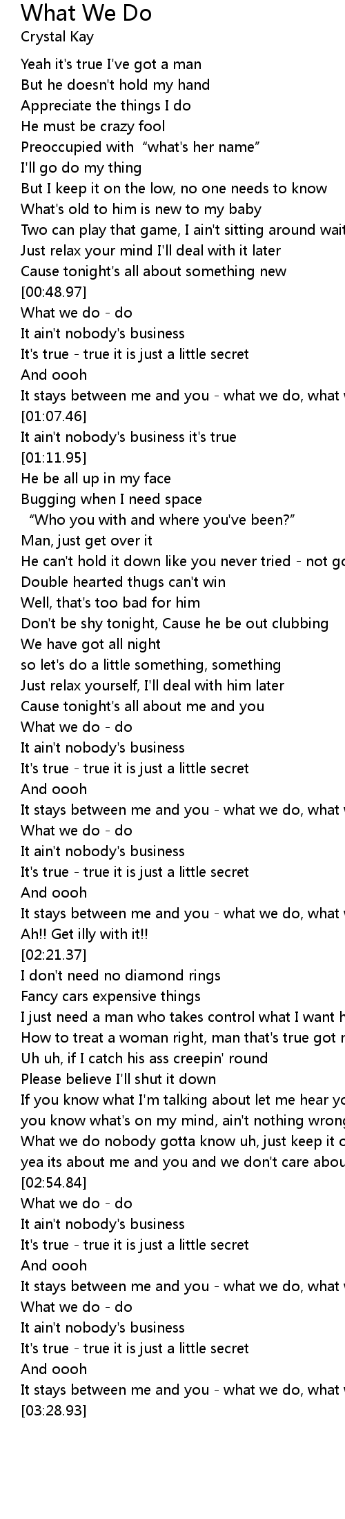 | [01:00.55] | It stays between me and you what we do, what we do |