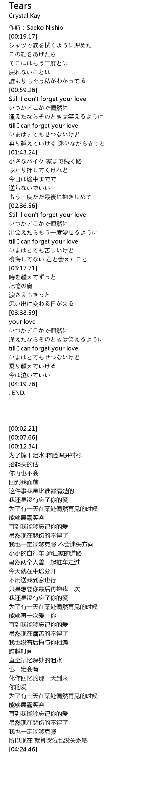| [00:12.34] | 作詩:Saeko Nishio |