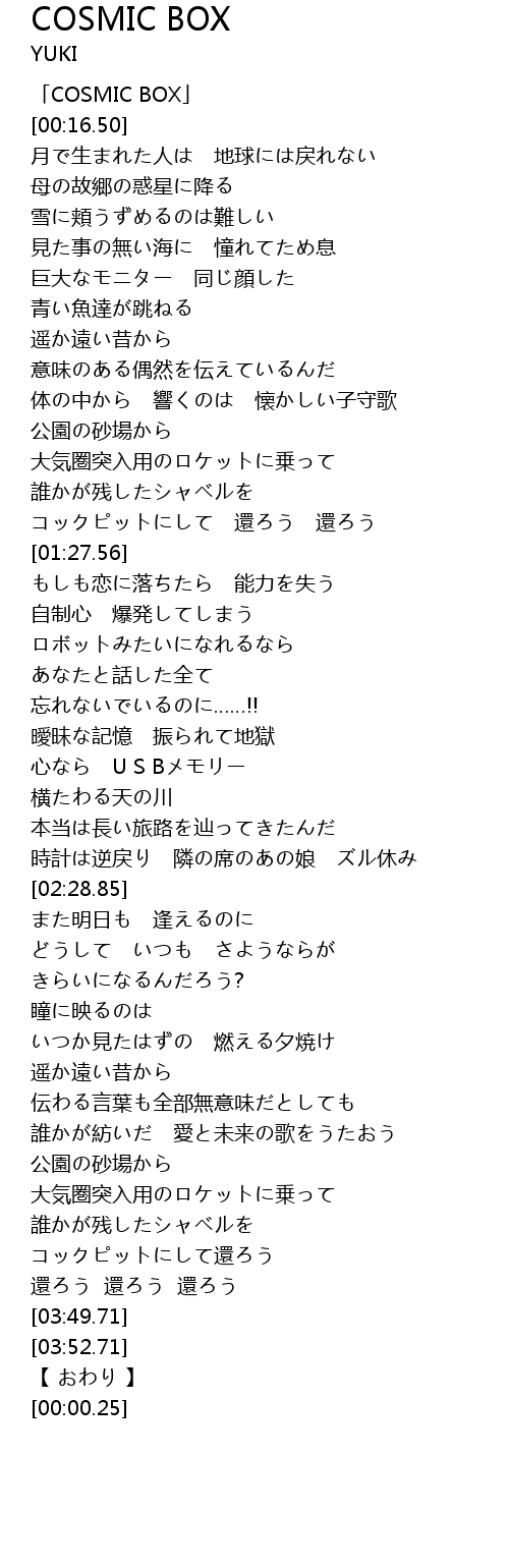 | [00:59.19] | 体の中から 響くのは 懐かしい子守歌 |