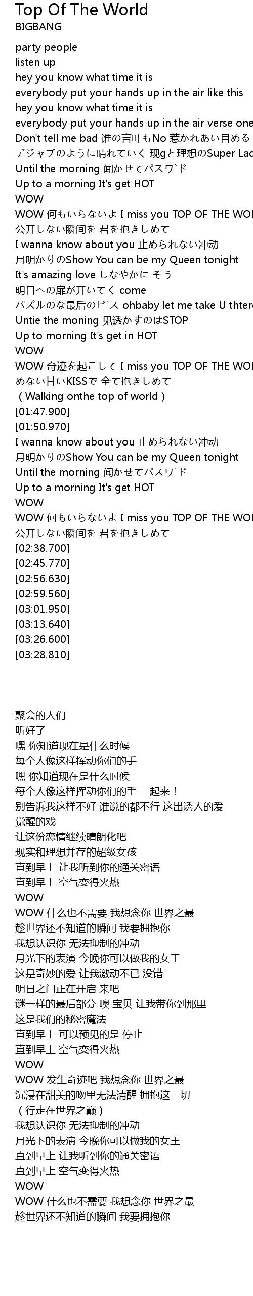 | [01:31.680] | WOW qi ji qi I miss you TOP OF THE WORLD |