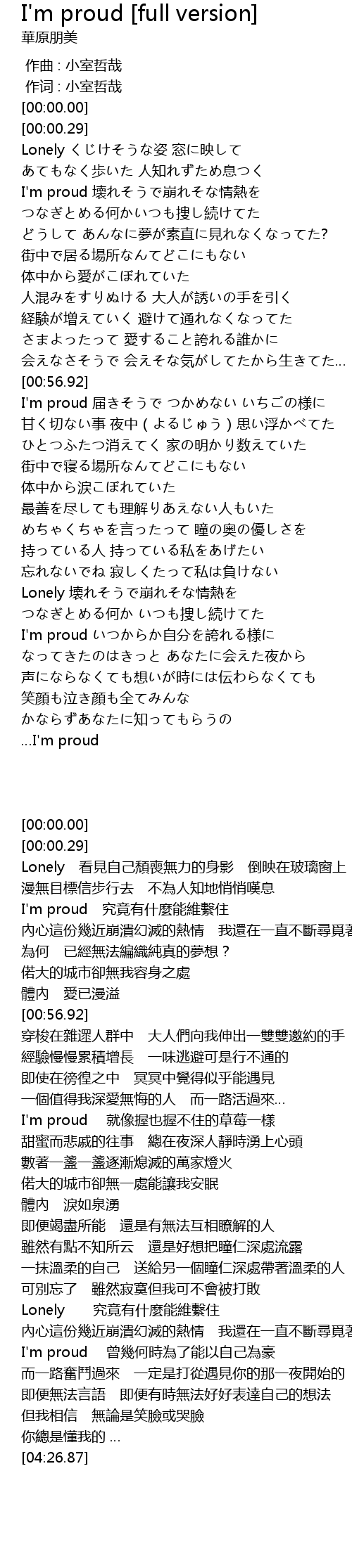 | [00:18.68] | I'm proud 壊れそうで崩れそな情熱を |